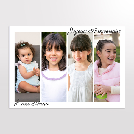 Le modèle Évolution Âge met en scène une composition émotive et chronologique, parfaite pour illustrer la croissance et les moments importants d’un enfant au fil des années. L’affiche est construite en quatre photos verticales de même largeur, disposées côte à côte pour créer une frise visuelle harmonieuse.