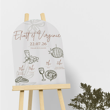 Conçu sur support rigide en PVC, le panneau se décline en différents formats et styles pour s’adapter à l’ambiance de votre cérémonie : bohème, chic, champêtre ou minimaliste. Vous pouvez y intégrer des visuels floraux, des typographies élégantes ou même un motif assorti à votre papeterie. Résistant et léger, il est facile à fixer sur une arche en bois, en métal ou en tissu.