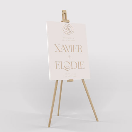 Cette pancarte de mariage personnalisée se distingue par son esthétique sobre et raffinée. L’association d’une typographie délicate et d’un motif floral finement dessiné crée un équilibre harmonieux, idéal pour une célébration placée sous le signe de l’élégance. Les teintes douces apportent une atmosphère chaleureuse et romantique dès l’arrivée des invités.