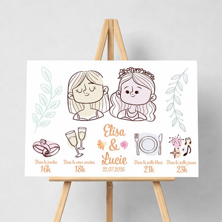 Nos pancartes sont livrées prêtes à poser : sur un chevalet, accrochées ou posées sur une table. Grâce à leur qualité d’impression et leur finition soignée, elles s’intègrent naturellement dans votre décoration. La pancarte bienvenue mariage est bien plus qu’un panneau d’information : c’est le premier geste d’accueil de votre journée, plein d’émotion et de style.