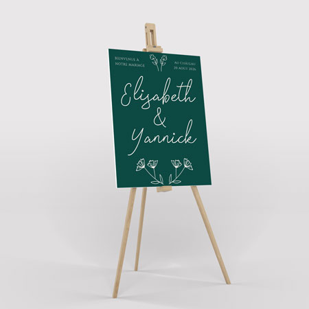Cette pancarte de mariage se distingue par son fond vert profond, qui évoque la nature, l’élégance et la sérénité. Les illustrations florales délicates en blanc apportent une touche poétique et subtile, créant un contraste harmonieux et moderne. L’ensemble dégage une atmosphère végétale chic, parfaite pour une célébration inspirée par la nature.