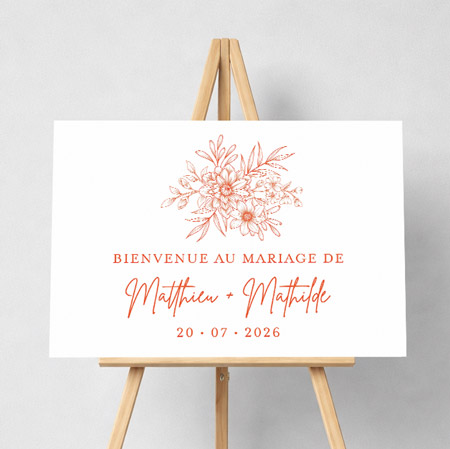Cette pancarte de mariage met en valeur une illustration florale fine et élégante, dessinée dans une teinte corail chaleureuse. Le contraste subtil entre le fond clair et les éléments graphiques apporte une sensation de légèreté et de modernité. L’ensemble évoque une atmosphère romantique et lumineuse, idéale pour une célébration pleine de douceur.